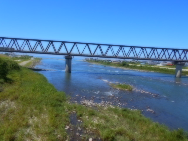 | 奈半利川を渡っています。土佐くろしお鉄道 「ごめん・なはり線」の鉄橋。気動車がはしっており、架線がないので鉄道かどうかよく見ないとわかりにくい。 |