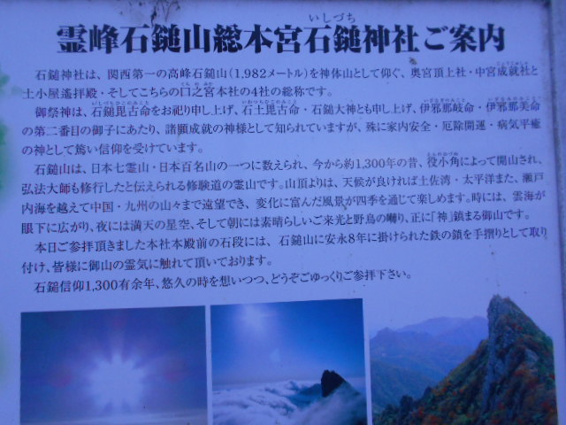 | 石鎚神社 石鎚山遥拝殿 この石鎚山遥拝殿は霊峰石鎚山の頂上に奥之宮頂上社として建立されていた石殿です。遥拝殿より遥かなる霊峰石鎚山頂を遥拝ください。 説明文を転載 |