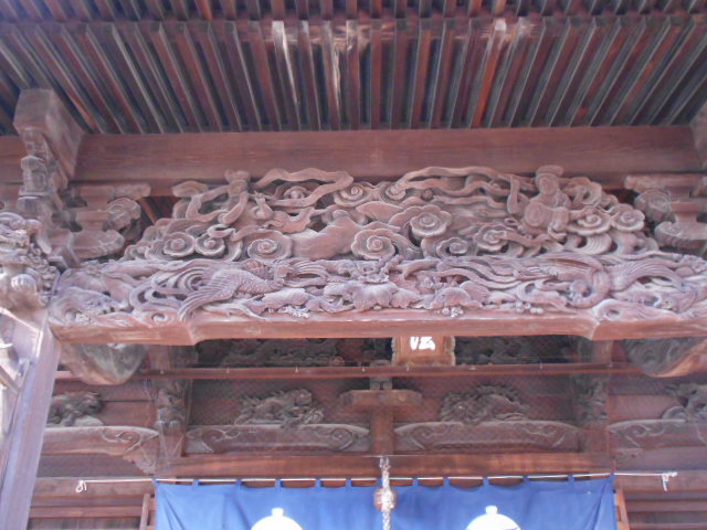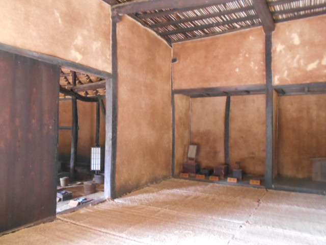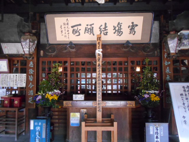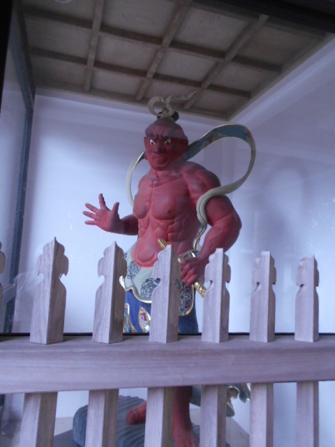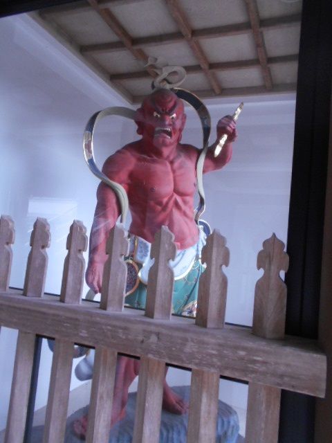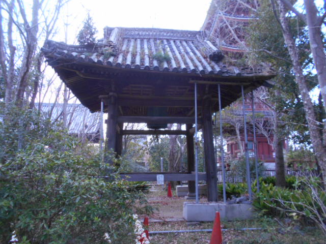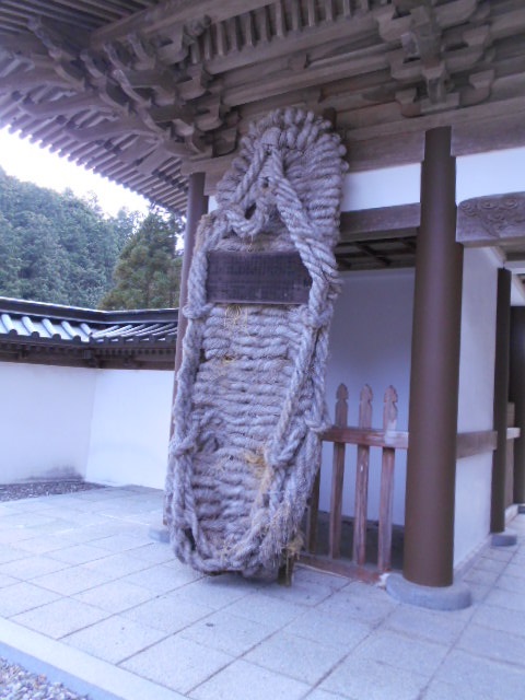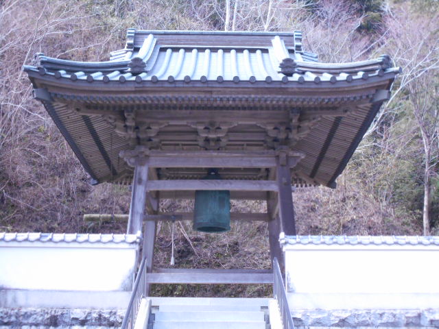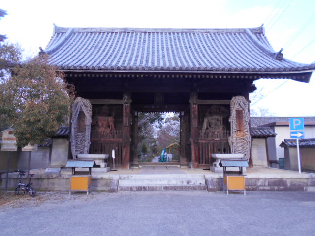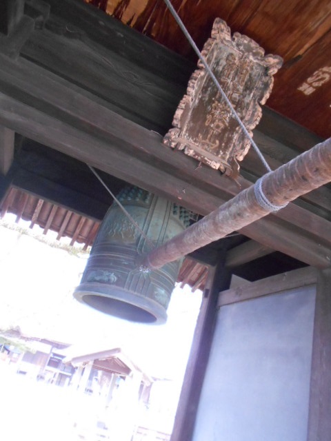 | 山門裏側。仁王の背面には草履。 通路中央に鐘がつってあり、鐘楼堂と兼ねている。 |