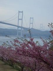 | 糸山展望台付近の桜はもう7部咲き。 | 来島海峡大橋を渡る。 | 大島に入った。寂しげな漁村を走っています。 |