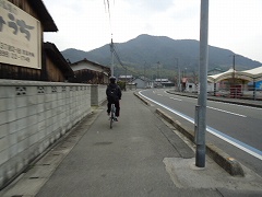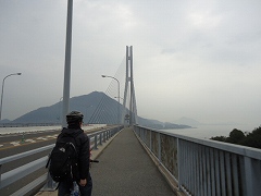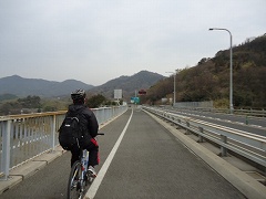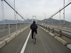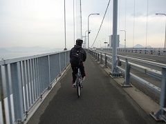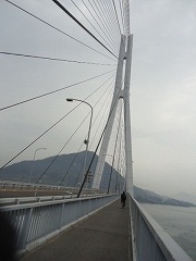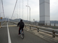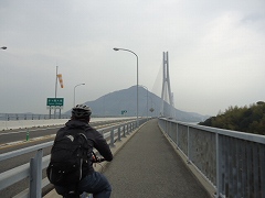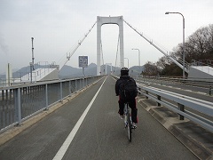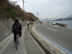 | 大島大橋入口。写真に見えるように原付と自転車は通行帯が分けられており、橋では桁の左側(広島に向かって)を自転車が走り、原付は右側を通ります。 | 大島大橋を快調に走る。 | |
