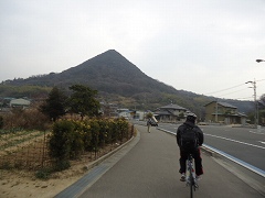 | 前に見えるのは八幡山。富士山のようなトンガリ山。 | きつい坂が続く。 | やっと次の橋:伯方・大島大橋が見えてきた。 |